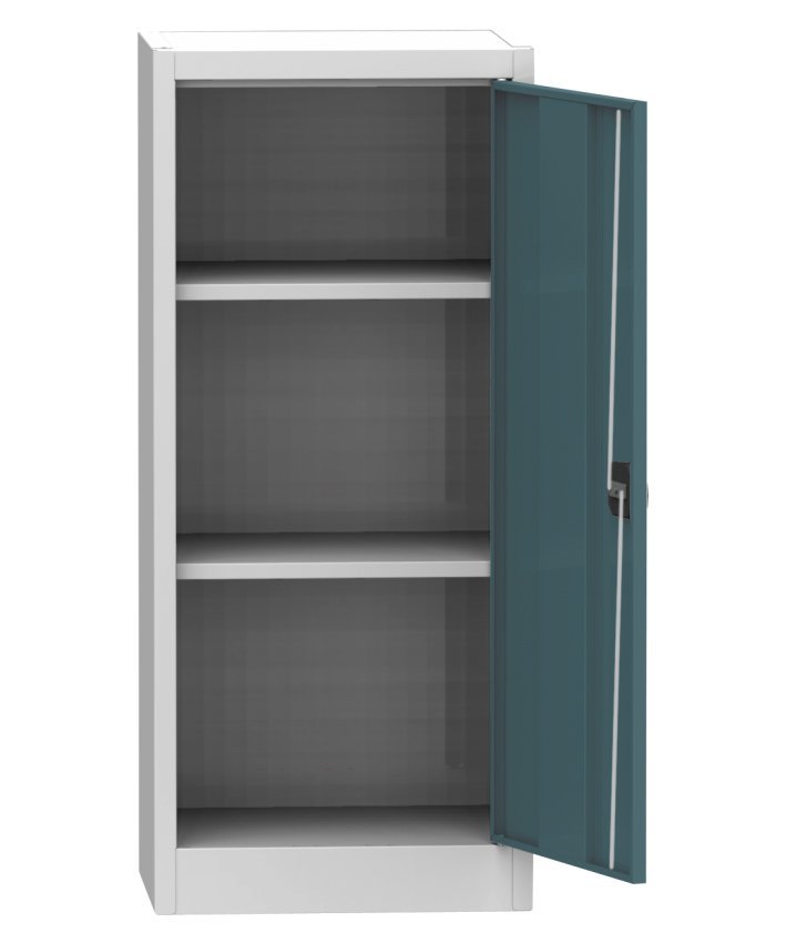 Cabinet with wire door, height 1150 x width 505 x depth 400 mm. Locking on a cylinder lock with a wheelbase mechanism. 2x adjustable steel shelves (load capacity 60 kg). Door with wire filling. Body color RAL 7035 light gray.