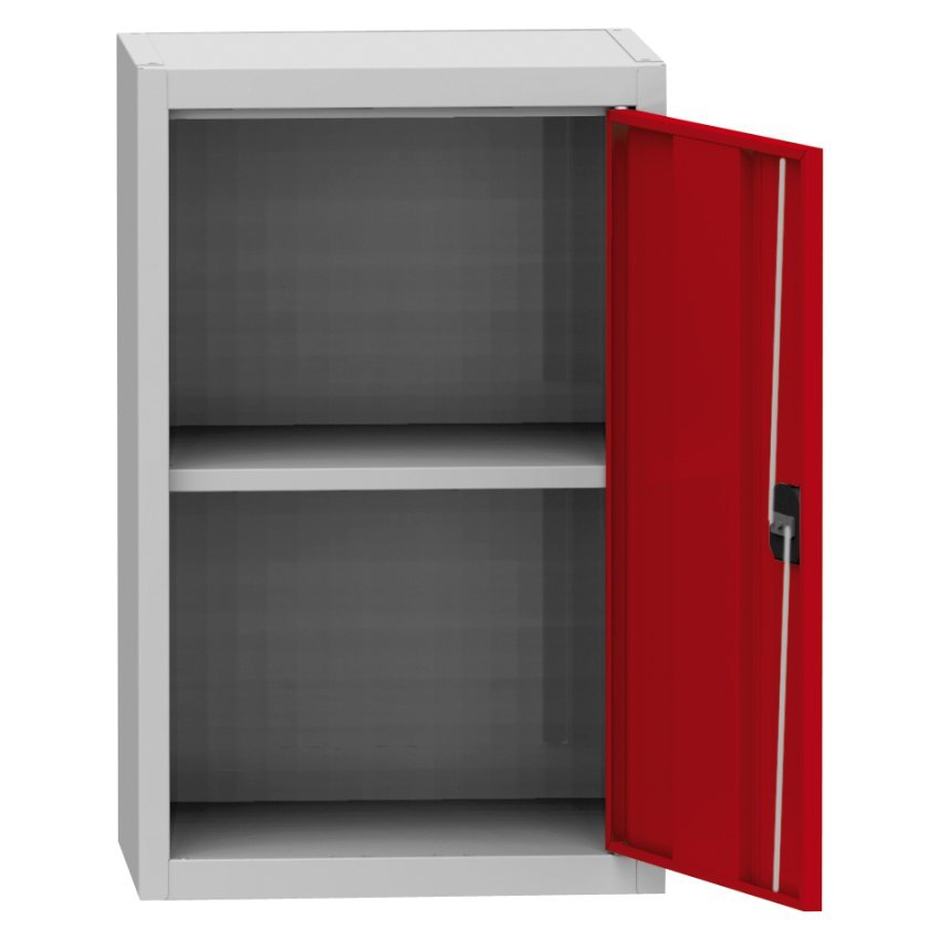 Metal cabinet with sliding doors, height 800 x width 950 x depth 400 mm, 1x adjustable shelf. Sliding door with lock in several color shades, body light gray RAL 7035.
