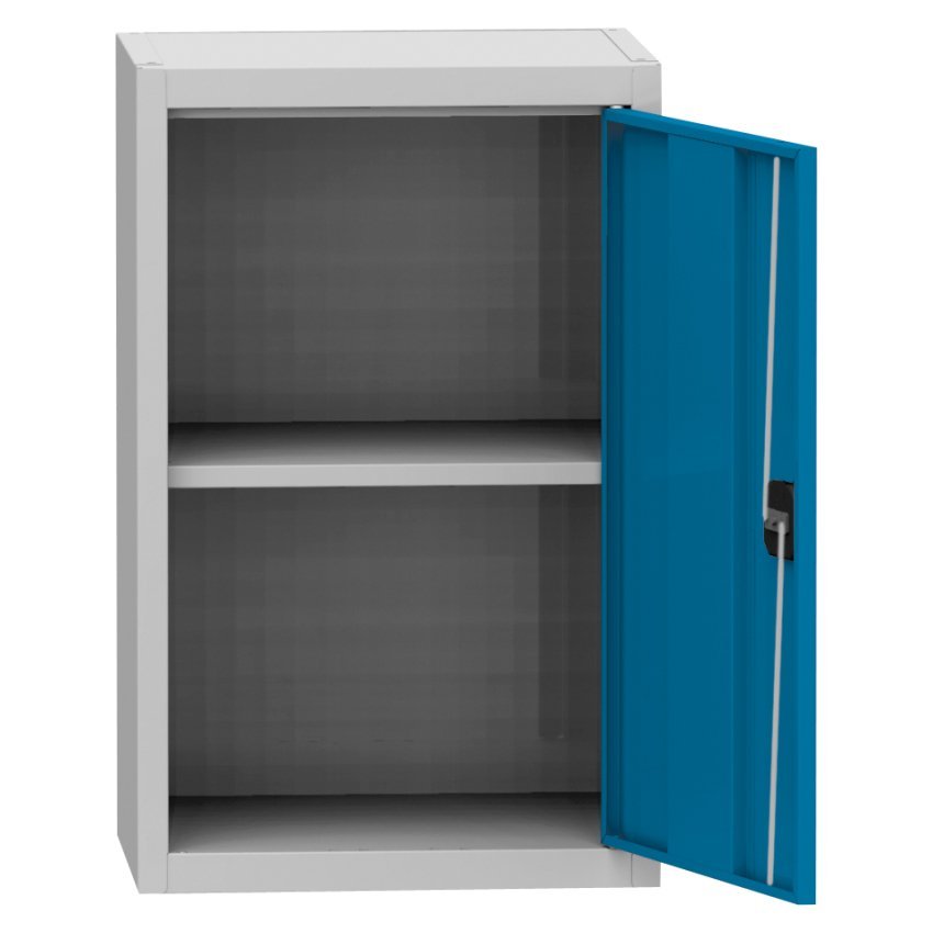 Cabinet with solid doors, height 1150 x width 505 x depth 400 mm. Locking on a cylinder lock with a wheelbase mechanism. 2 x adjustable steel shelves (load capacity 60 kg). The possibility of replacing solid doors with doors with glass filling, with wire filling or laminate doors in the shade of beech, birch or cherry. Body color RAL 7035 light gray.