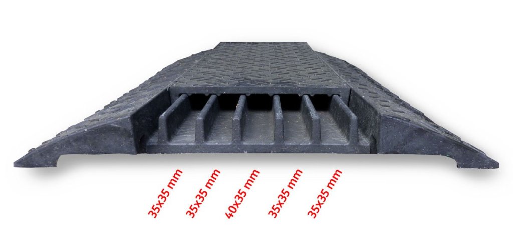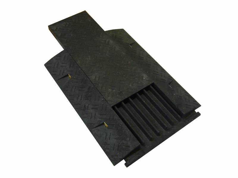 Cable bridge junction black with lid. It is used to protect cables, hoses, pipes that are laid over the road, in production facilities, exhibitions, cultural events, etc. Chemically stable, not easily flammable, easy to maintain. Quick assembly and disassembly, anti-slip and stability. Warranty 2 years.