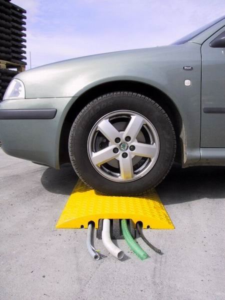 Cable bridge with insert, color yellow. It is used to protect cables, hoses, pipes that are laid over the road, in production facilities, exhibitions, cultural events, etc. Chemically stable, not easily flammable, easy to maintain. Quick assembly and disassembly, anti-slip and stability.