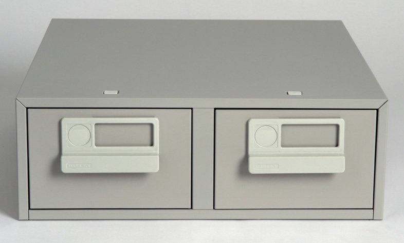 Two-drawer card filing cabinets for A7 format, width 384, height 133, depth 422 mm, cylindrical lock, various colors.