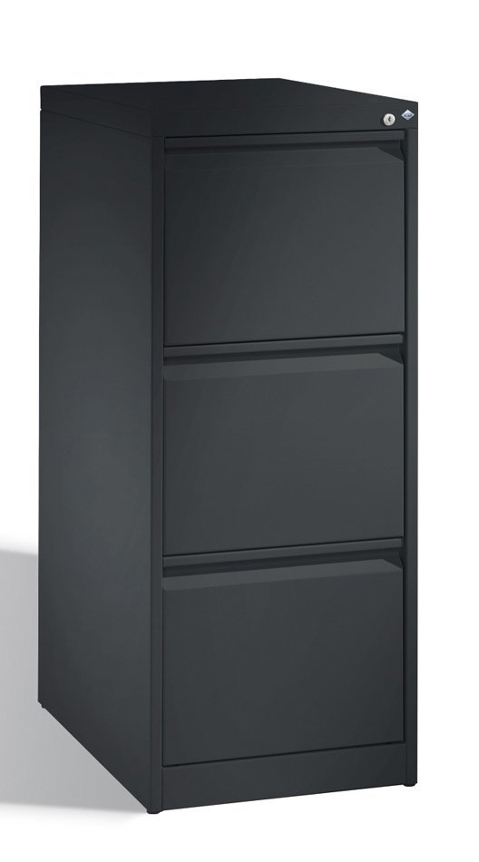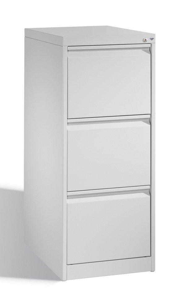 Three-drawer metal filing cabinets for documents or hanging files in A4 or Foolscap format, width 413 or 470, height 1016, depth 622 mm, central lock, various colors. Available in light gray or beige (width 413 mm).