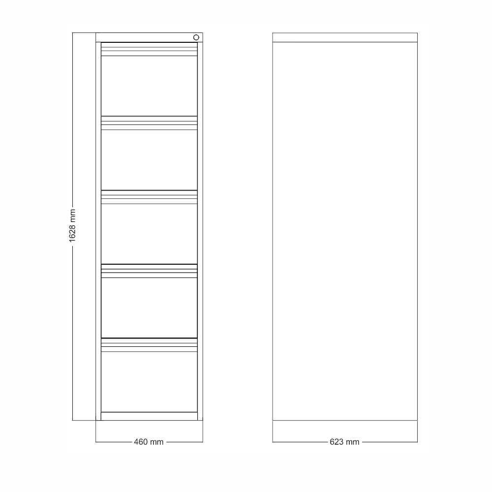 Card filing cabinet for A4 format with five drawers. Height 1628 x width 405 x depth 623 mm. Full extension of drawers, blocking against the extension of several drawers at once. Other colors on request.