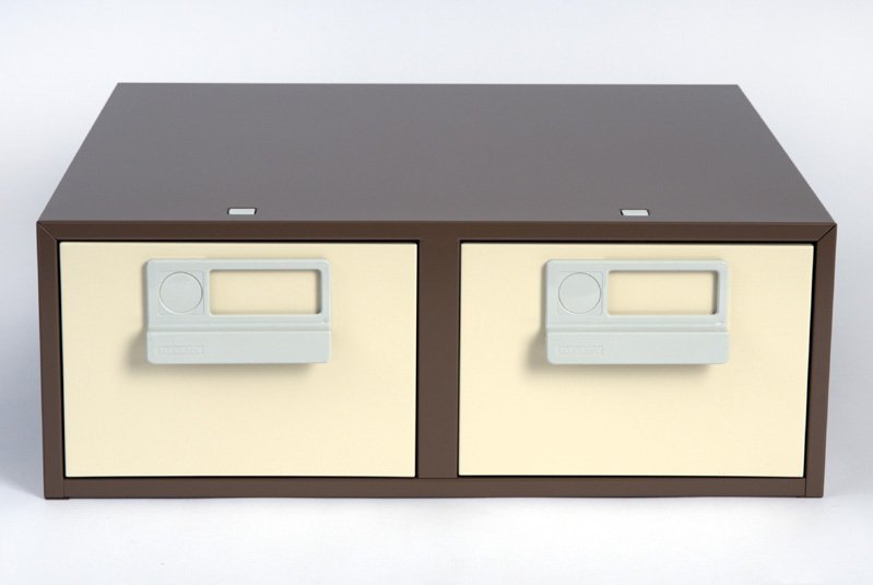 Two-drawer card filing cabinets for A7 format, width 384, height 133, depth 422 mm, cylindrical lock, various colors.