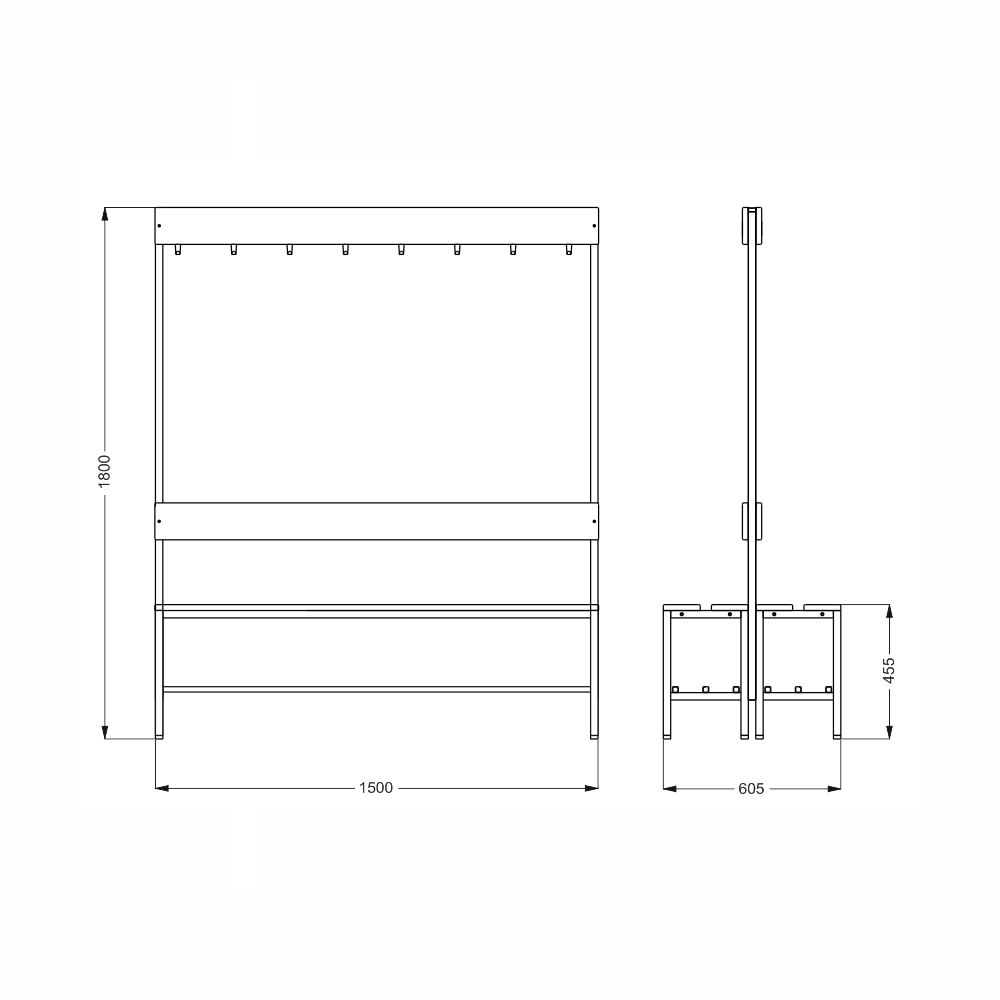 Changing room bench with hanger, double-sided width 1500 mm.