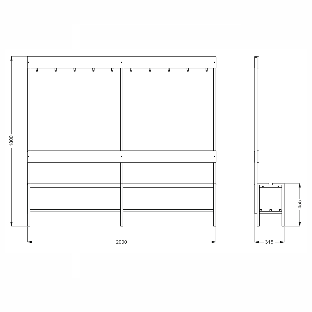 Changing room bench with hanger, double-sided width 2000 mm.