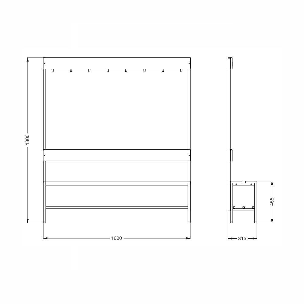 Changing room bench with hanger, one-sided width 1600 mm. full description and parameters