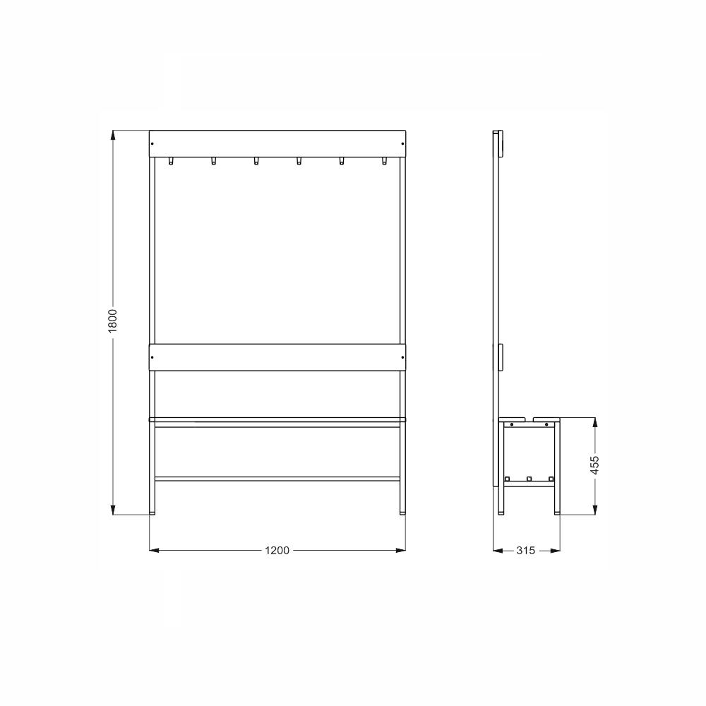 Changing room bench with hanger, one-sided width 1200 mm. full description and parameters