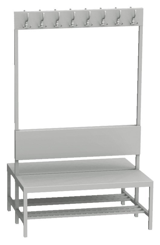 Clothing bench with backrest and hanger 1000 mm double-sided. Height 1800, width 1000, depth 830 mm, 16 hangers (8 x 2). Color light gray RAL 7035.