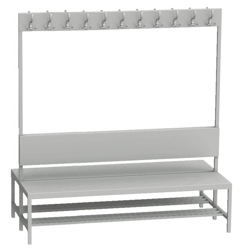 Clothing bench with backrest and hanger 1500 mm double-sided. Height 1800, width 1500, depth 830 mm, 22 hangers (11 x 2). Color light gray RAL 7035.