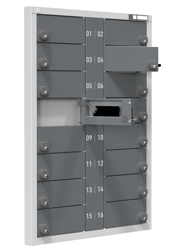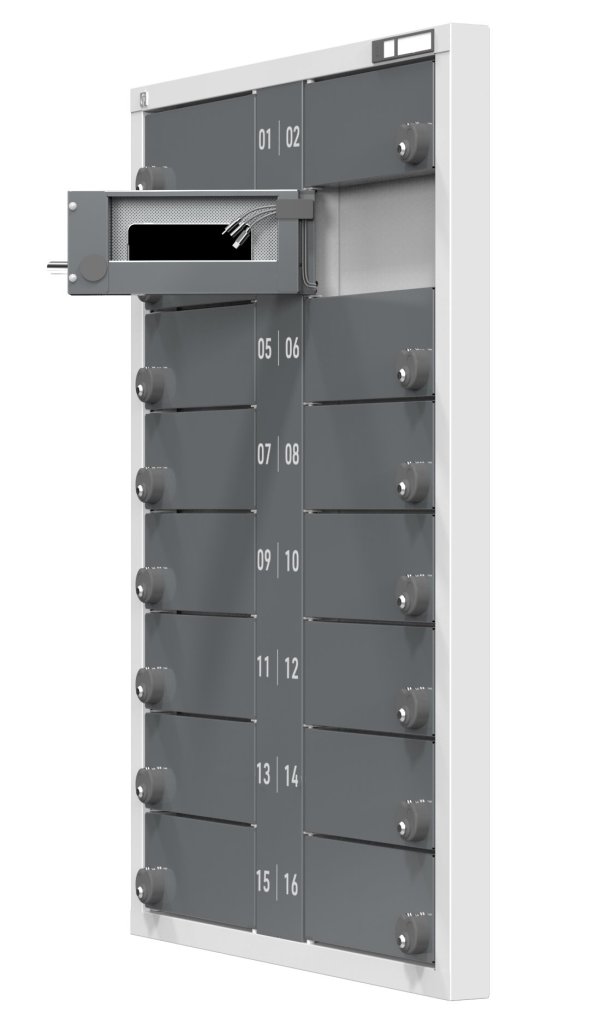 Charging box for mobile phones, allows charging up to 16 mobile phones at once. Height 1155 x Width 830 x Depth 57mm. 3 different connectors with safe charging cables - micro USB, USB-C and Apple lighting. The interior of the boxes is lined with 3D fabric for comfortable storage. Locking with cylinder or coin lock.