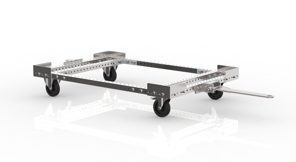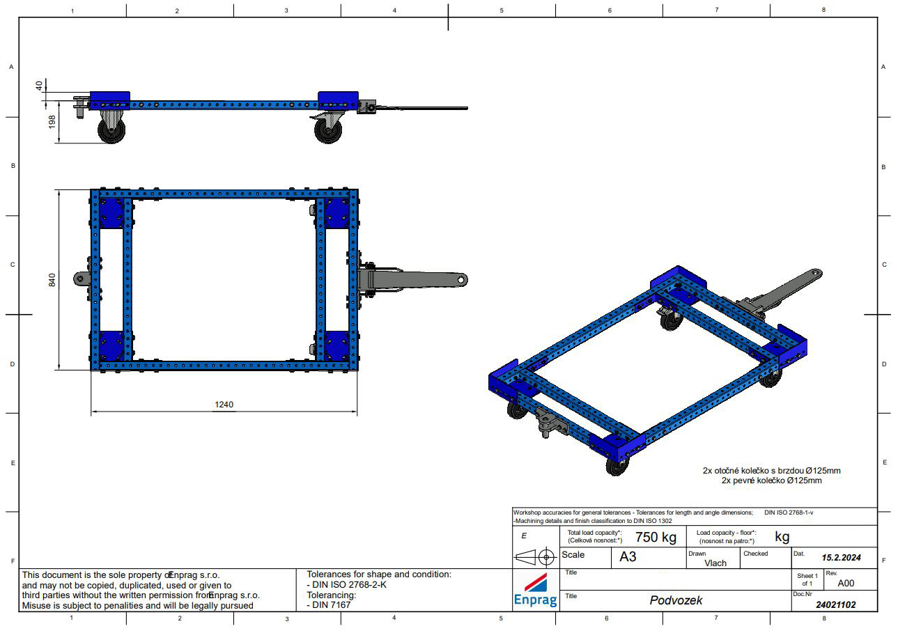 Manipulation chassis made of pre-assembled steels with a size of 40x40 mm suitable for various handling purposes in warehouses and workshops. Thanks to its high load capacity of 750 kg, it is ideal for transporting heavier objects. The chassis includes 2 swivel wheels with a brake and 2 swivel wheels without a brake with a diameter of 125 mm, which allow easy handling of objects. The chassis is available in several variants - galvanized surface or colored lacquer. Dimensions 350 x 840 x 1350 mm.