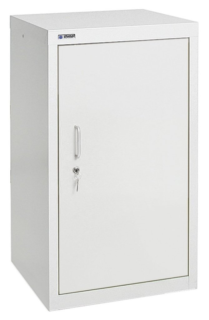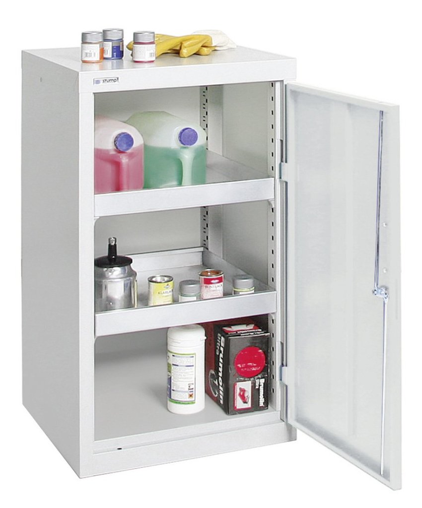 Cabinet for storing chemical substances with trays for catching leaking liquids. 2x galvanized adjustable shelf (tray) with a load capacity of 100 kg. Two-point cylinder lock. Body color light gray RAL 7035, door color light gray RAL 7035, blue RAL 5010 or yellow RAL 1003. Height 900 x width 1000 x depth 500 mm.