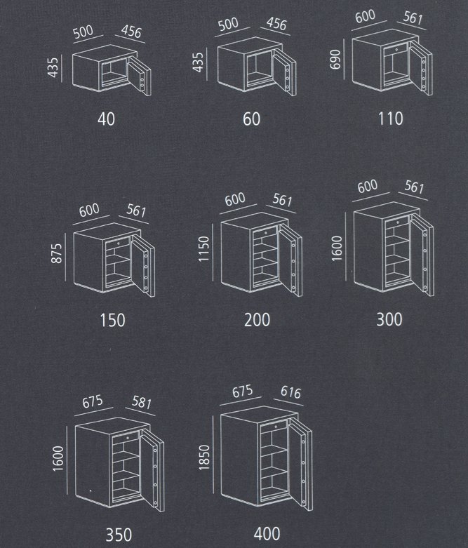 Fireproof safes for documents, data and valuables, fire resistance 60 minutes, drop test, safety class I. The interior space can be equipped with an insert for storing computer media - the parameters will thus be increased to the level of protection of computer data carriers. Prices without interior equipment - see ADDITIONAL PURCHASE.