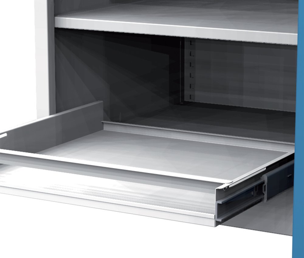 Computer cabinet with lockable door, one adjustable shelf, pull-out printer drawer and pull-out keyboard shelf behind hinged door. Height 1850 x width 610 x depth 600 mm, weight 75.6 kg. Body color RAL 7035 light gray.