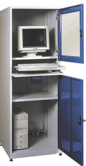 Computer case made of 0.8 mm thick steel sheet. The glass part is adapted to the depth of the 22-inch LCD display. pull-out keyboard shelf. The back has ventilation holes. A sliding shelf inside the cabinet allows adjustment according to the size of the computer. Dimensions in mm (h x w x d) 1750 x 640 x 630. Without electrical equipment.