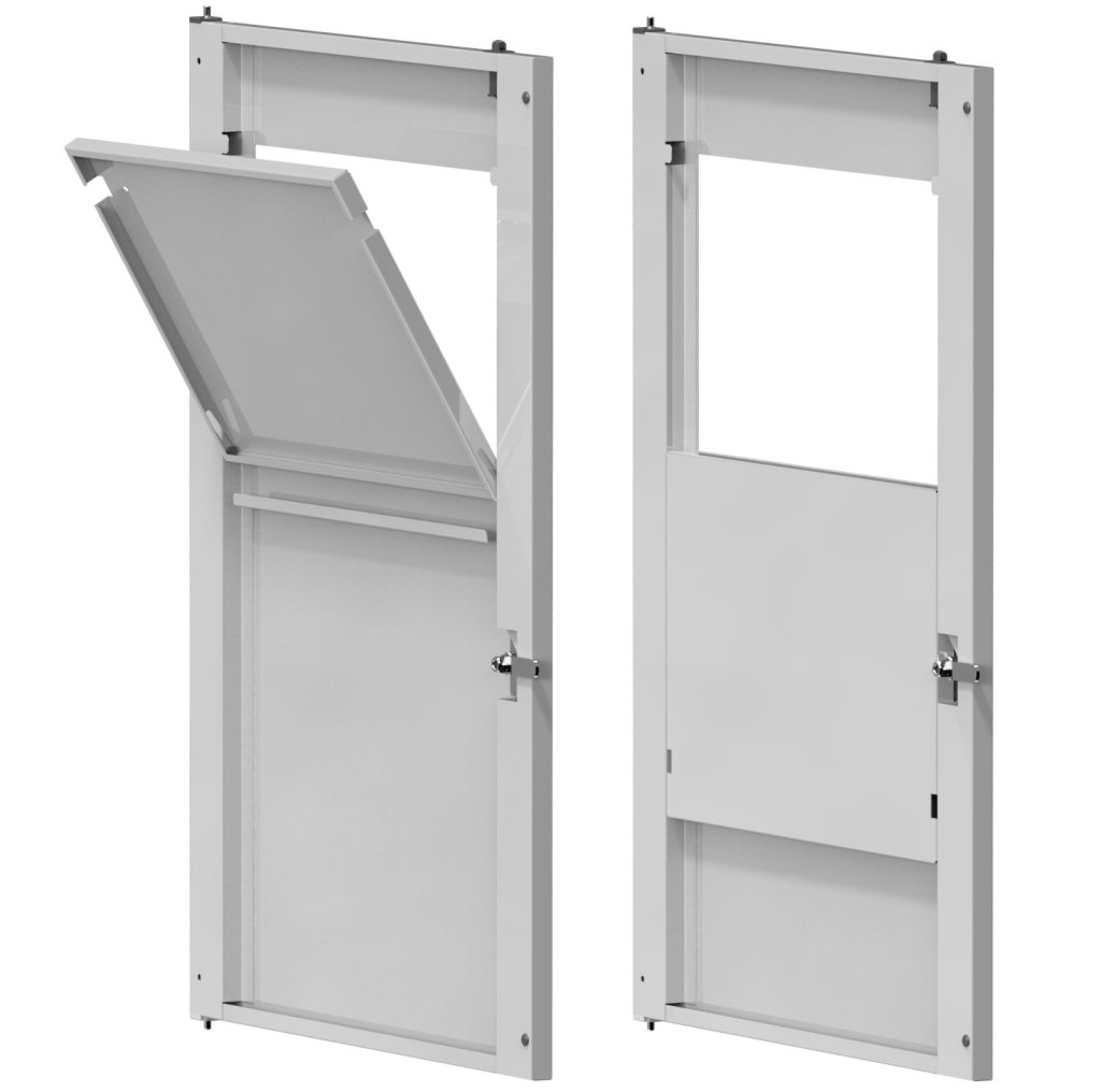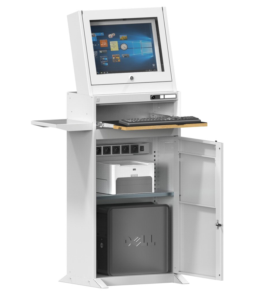 Computer terminal TPC1 with electrical sockets. Hinged door with tempered glass and sliding monitor holder, wooden drawer with hinged front for keyboard, double door for easy access to the printer, hinged side shelf. Overall dimensions - height 1666 x width 660 x depth 531 mm.