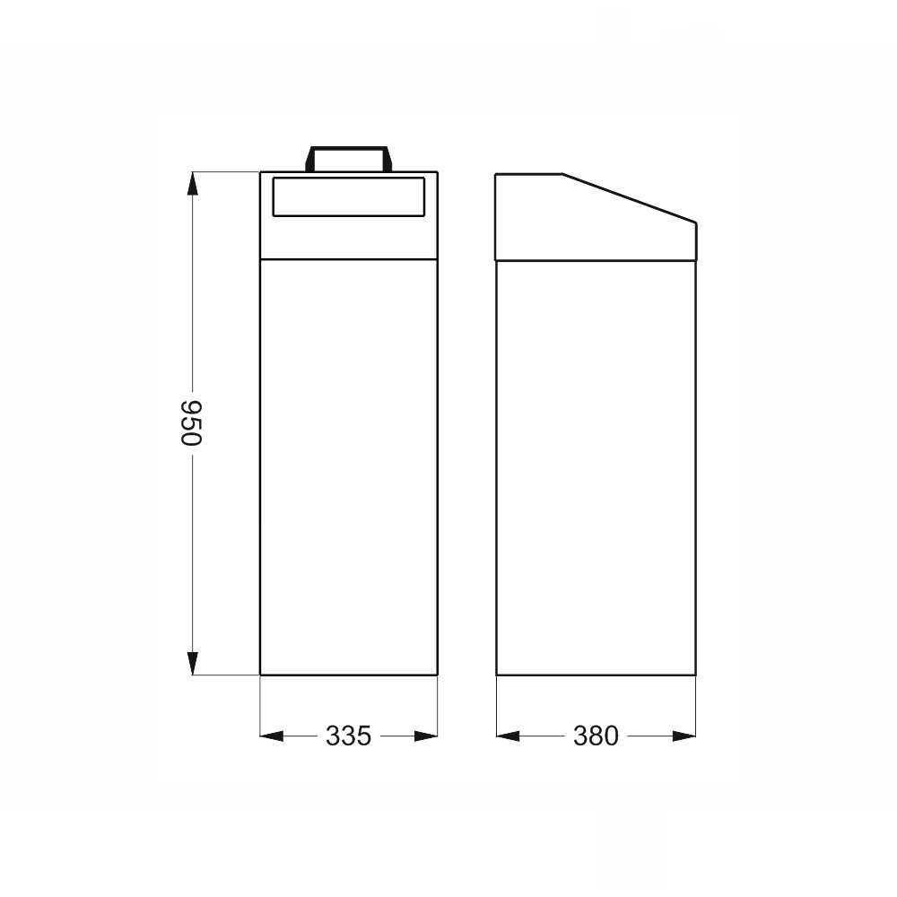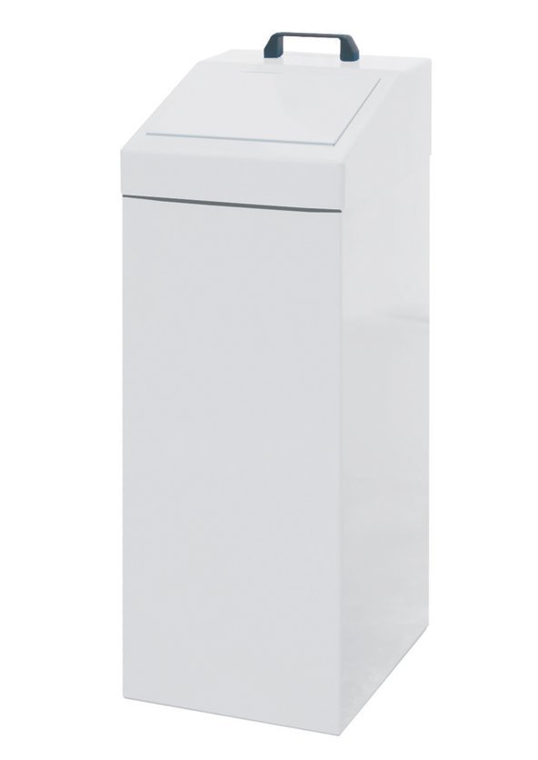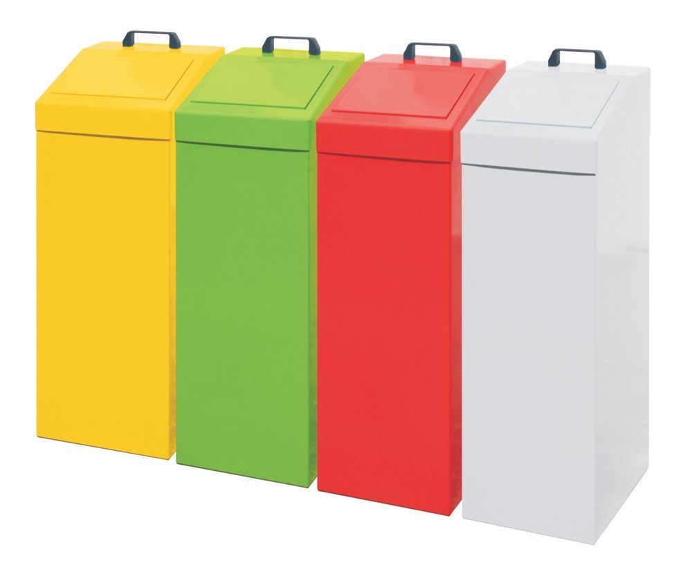 Metal container for sorted waste in different colors. Height 950 x width 335 x depth 380 mm. Self-closing drop-in flap, removable lid. Please use a 100 l PE bag.