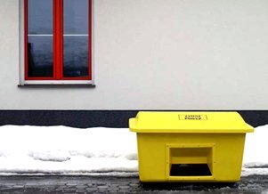 Containers for winter sprinkling are intended for storing sprinkling material (sand, gravel, salt, etc.). The containers are made of durable fiberglass with stainless steel hinges. Yellow color. Volume 550 l, dimensions h. 740 x w. 1325 x d. 980 mm.