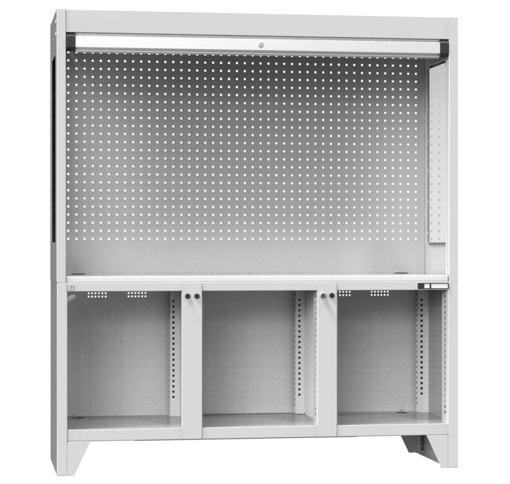 Laminated worktop 28 mm thick, self-winding blind with aluminum slats RAL 7035, tempered side glass, perforated back wall. Height 2030, width 1800, depth 600 or 800 mm.