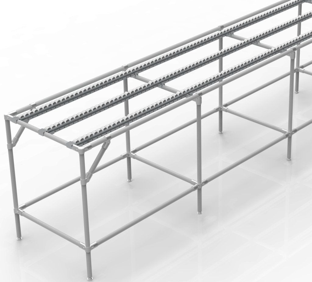 The conveyor system with roller tracks (also known as roller conveyors) is ideal for the smooth transport of KLT boxes, packages, and other individual products. Thanks to its modular tubular design, the system can be easily adapted and customized to meet specific operational requirements.