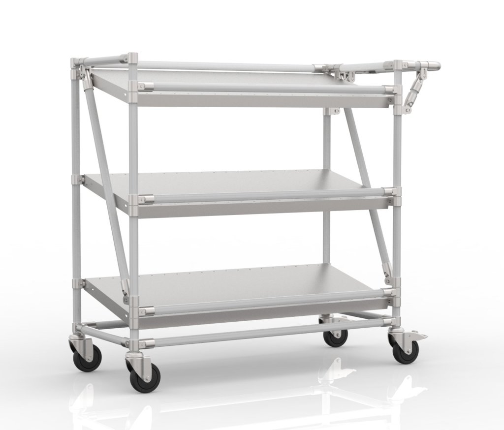 The rack trolley for crates with three slanted shelves is a practical aid for handling in manufacturing companies and logistics centers, especially in the field of e-commerce. The trolley includes two swivel castors with a brake and two swivel castors without a brake with a diameter of 100 mm. The advantage of these wheels is low rolling resistance and, thanks to this, comfortable handling. The configuration of the wheels can be changed according to the customer's requirements. The trolley is also equipped with an ergonomic handle for easier and more comfortable handling. Total load capacity 180 kg, load capacity on the shelf 60 kg. Dimensions 1078 x 1066 x 465 mm.