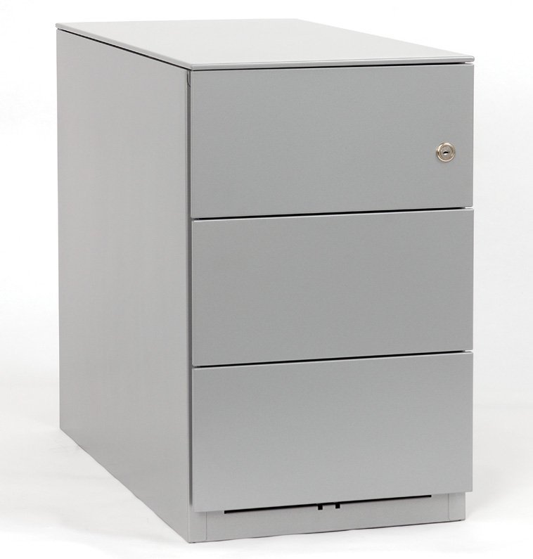 Mobile narrow office containers, central lock, 2 x standard drawers, one for hanging files. Height 645 or 651, width 300, depth 565 mm. The fifth wheel on the bottom edge of the deep drawer ensures stability even when it is fully opened. Variant without top plate or with top decorative plate 6 mm thick. Extension of standard drawers 80 or 100%, extension of high drawer 100%.