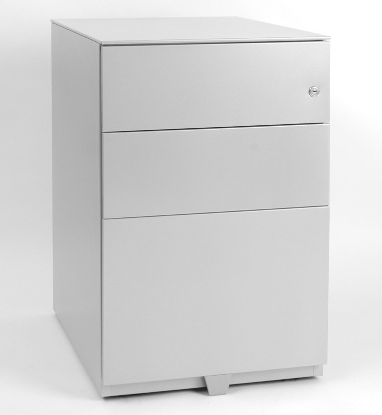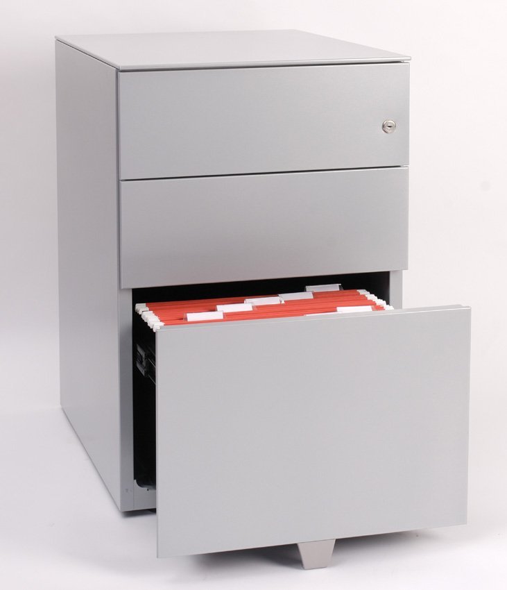 Office containers mobile narrow, central lock, one standard drawer, one for hanging files. Height 495 or 501, width 300, depth 565 mm. The fifth wheel on the bottom edge of the deep drawer ensures stability even when it is fully opened. Variant without top plate or with top decorative plate 6 mm thick. Standard drawer extension 80 or 100%, high drawer extension 100%.
