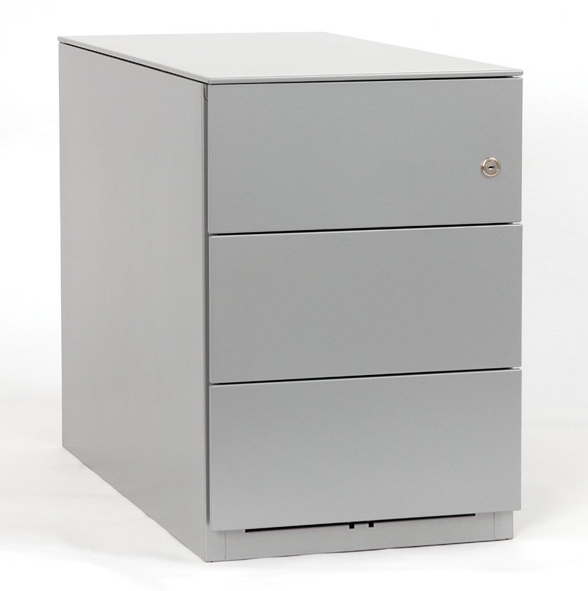 Mobile narrow office containers, central lock, 2 x standard drawers, one for hanging files. Height 645 or 651, width 300, depth 565 mm. The fifth wheel on the bottom edge of the deep drawer ensures stability even when it is fully opened. Variant without top plate or with top decorative plate 6 mm thick. Extension of standard drawers 80 or 100%, extension of high drawer 100%.