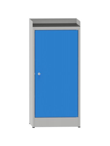 One-door workshop cabinet, width 505, height 1950, depth 600 mm, 4 shelves. Option to replace solid doors with a frame with tempered glass or a wire mesh for a better overview of the contents of the cabinet. Body capacity 800 kg, shelf capacity 100 kg. Body color RAL 7035 light gray. In stock in full door design, door color blue RAL 5012.
