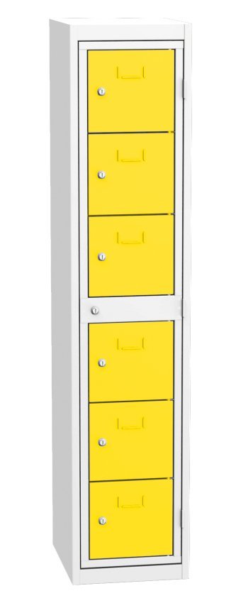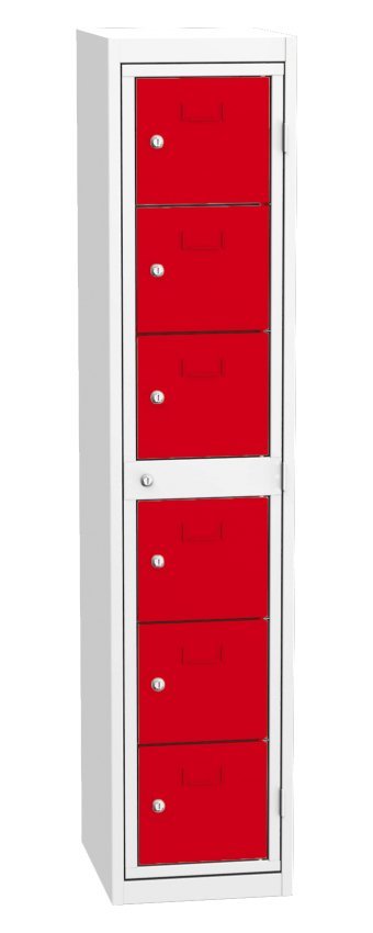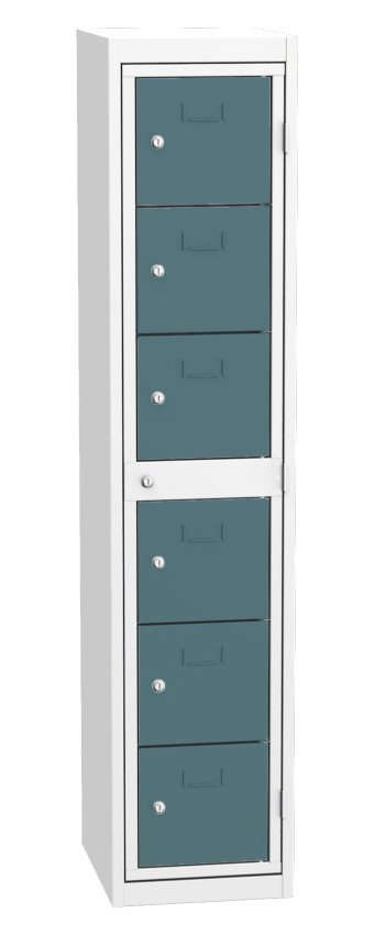Cabinet for dispensing clean work clothes, width 380, height 1770, depth 460 mm. It contains six dispensing boxes and one central frame for the operator. Each dispensing box and the central operator frame are locked with a cylinder lock. Body color RAL 7035 light gray.