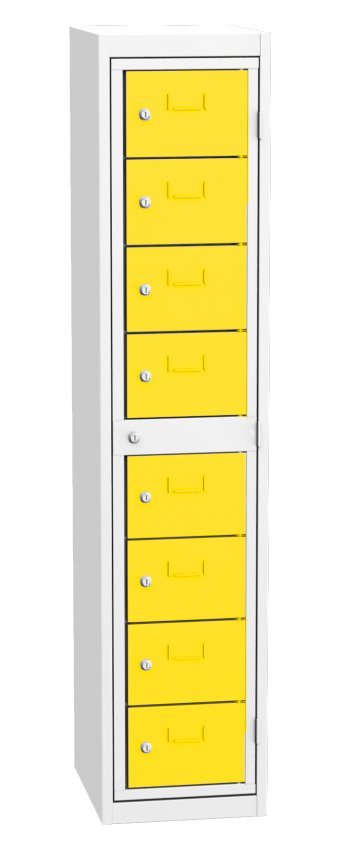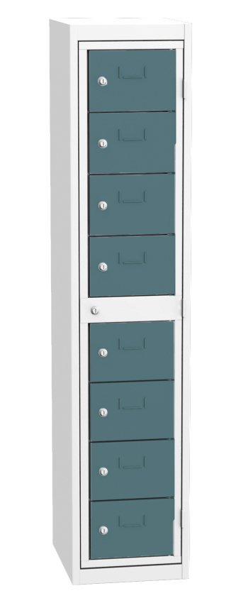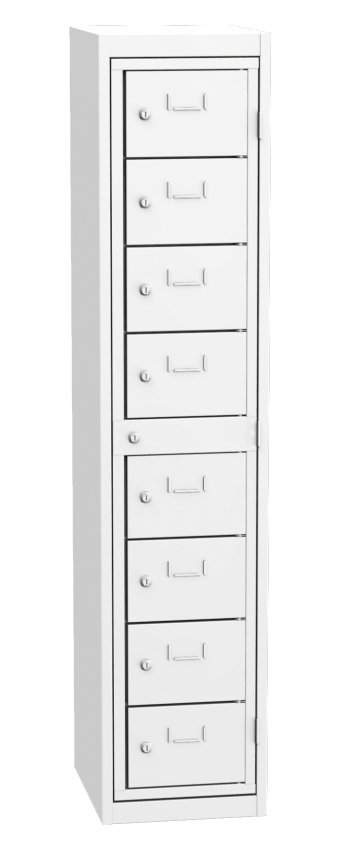Cabinet for dispensing clean work clothes, width 380, height 1770, depth 460 mm. It contains eight dispensing boxes and one central frame for the operator. Each dispensing box and the central operator frame are locked with a cylinder lock. Body color RAL 7035 light gray.