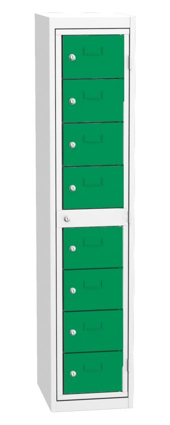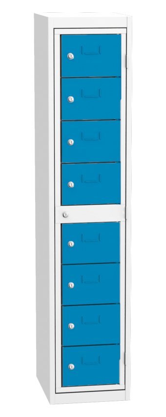 Cabinet for dispensing clean work clothes, width 380, height 1770, depth 460 mm. It contains ten dispensing boxes and one central frame for the operator. Each dispensing box and the central operator frame are locked with a cylinder lock. Body color RAL 7035 light gray.