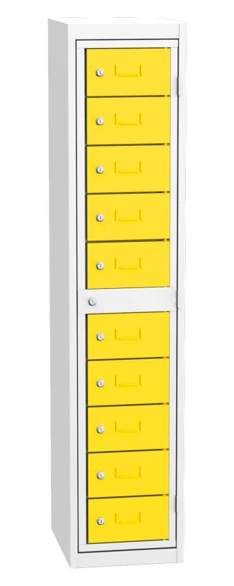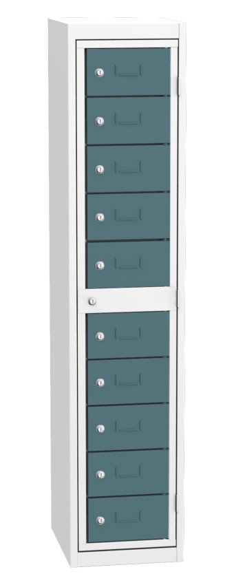 Cabinet for dispensing clean work clothes, width 380, height 1770, depth 460 mm. It contains ten dispensing boxes and one central frame for the operator. Each dispensing box and the central operator frame are locked with a cylinder lock. Body color RAL 7035 light gray.