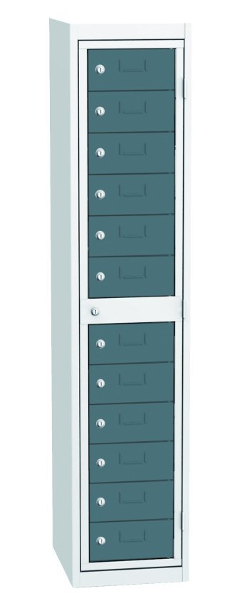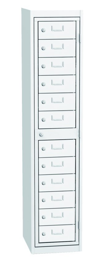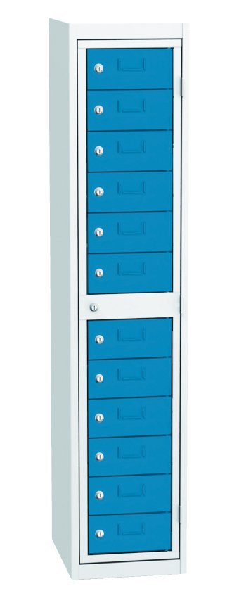 Cabinet for dispensing clean work clothes, width 380, height 1770, depth 460 mm. It contains twelve dispensing boxes and one central frame for the operator. Each dispensing box and the central operator frame are locked with a cylinder lock. Body color RAL 7035 light gray.