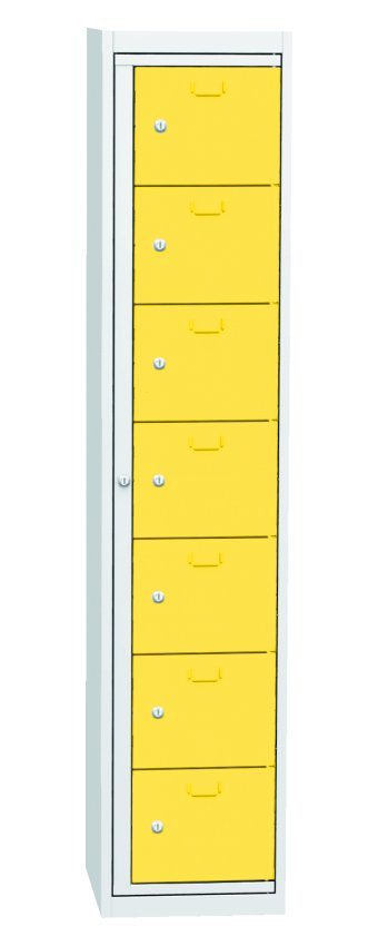 Cabinet for dispensing clean work clothes, width 380, height 1770, depth 460 mm. It contains seven dispensing boxes and one central frame for the operator. Each dispensing box and the central operator frame are locked with a cylinder lock. Body color RAL 7035 light gray.