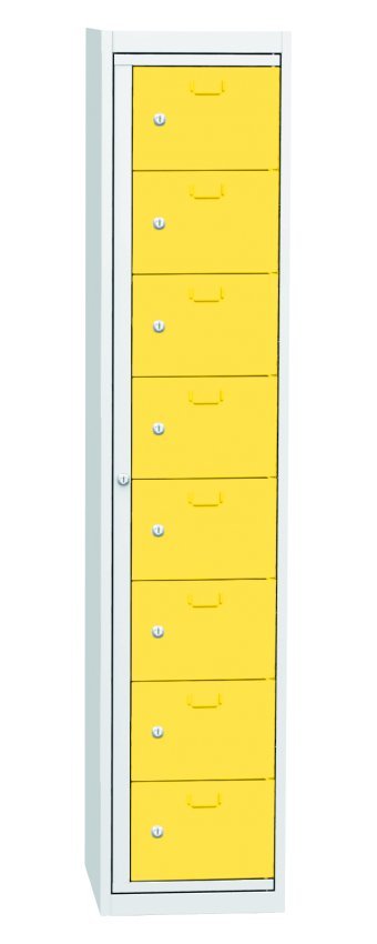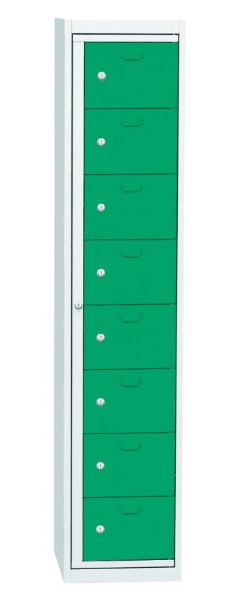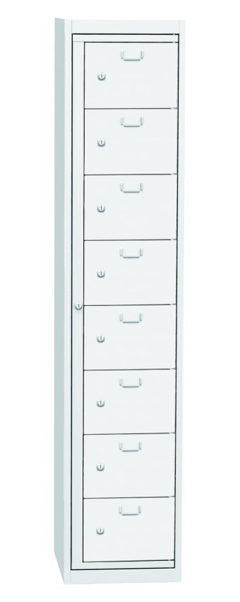 Cabinet for dispensing clean work clothes, width 380, height 1770, depth 460 mm. It contains eight dispensing boxes and one central frame for the operator. Each dispensing box and the central operator frame are locked with a cylinder lock. Body color RAL 7035 light gray.