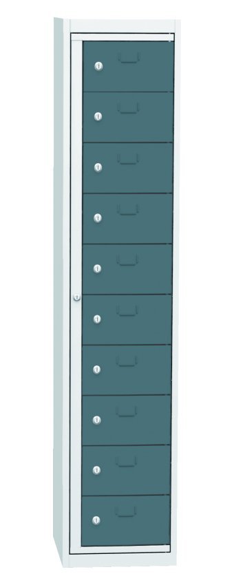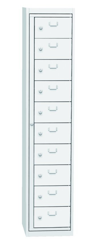 Cabinet for dispensing clean work clothes, width 380, height 1770, depth 460 mm. It contains ten dispensing boxes and one central frame for the operator. Each dispensing box and the central operator frame are locked with a cylinder lock. Body color RAL 7035 light gray.