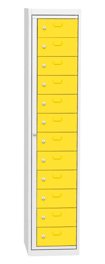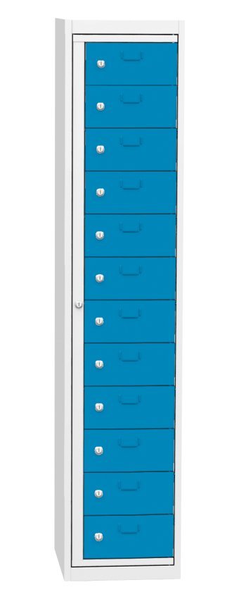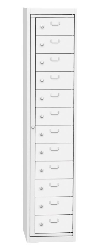 Cabinet for dispensing clean work clothes, width 380, height 1770, depth 460 mm. It contains twelve dispensing boxes and one central frame for the operator. Each dispensing box and the central operator frame are locked with a cylinder lock. Body color RAL 7035 light gray.