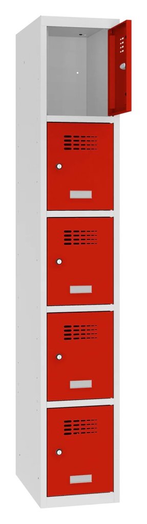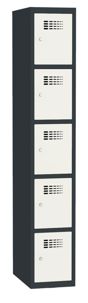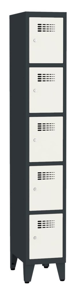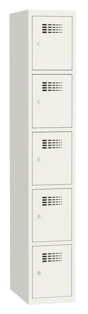 Five-door metal wardrobe with welded construction and modern ventilation system design. Height 1800 x width 300 x depth 500 mm. Self-adhesive name tag on the door. 16 color shades to choose from included in the price without extra charge. Different types of locking.