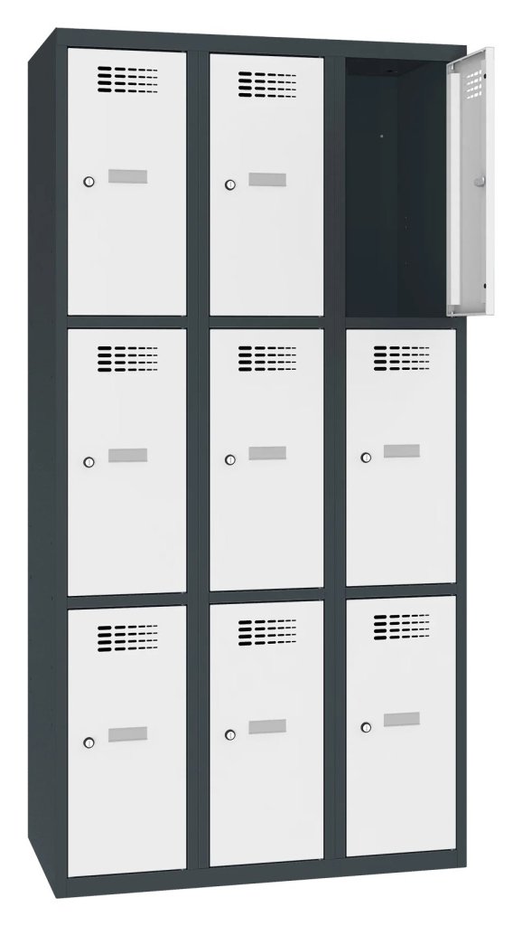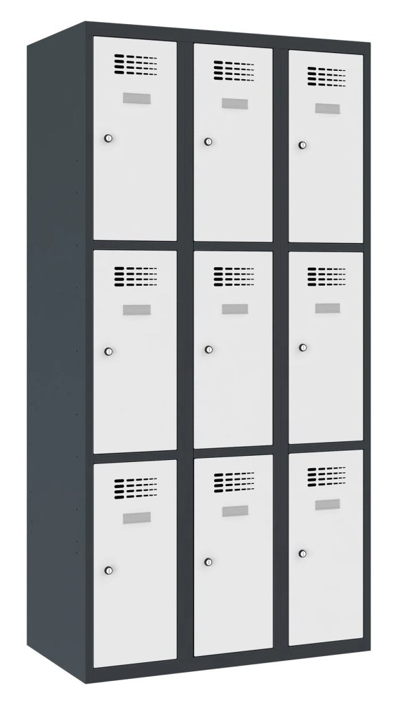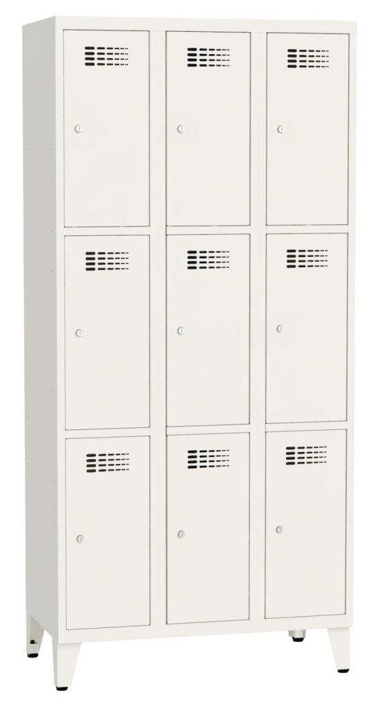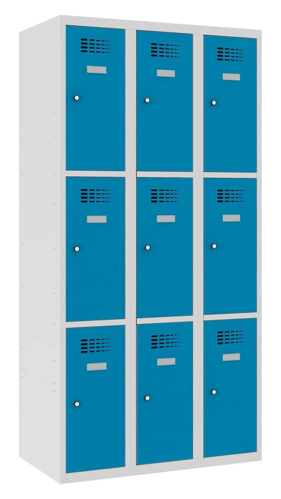 Nine-door metal wardrobe with welded construction and modern ventilation system design. Height 1800 x width 900 x depth 500 mm. Self-adhesive name tag on the door. 16 color shades. Different types of locking.