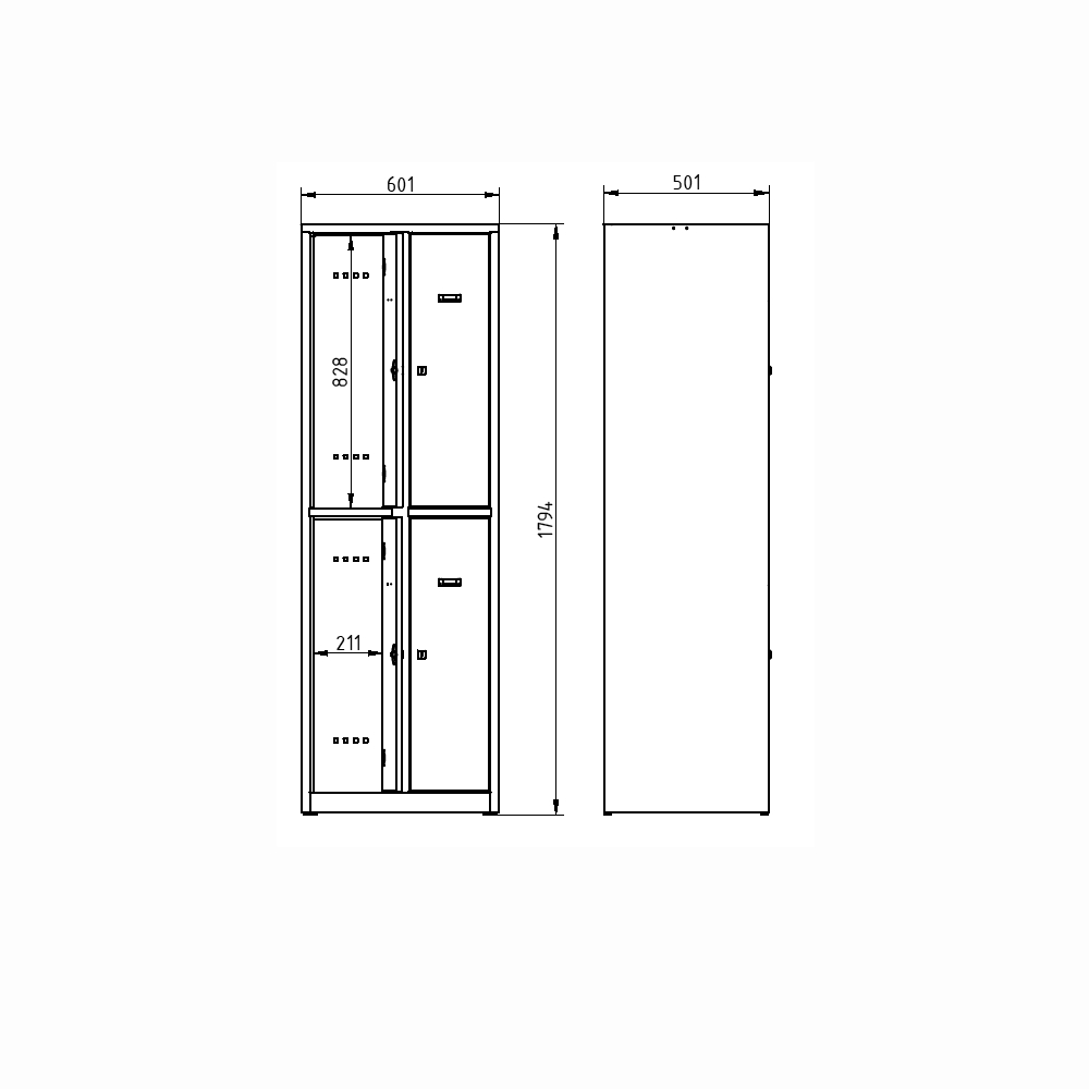 Metal divided wardrobe with laminate doors in beech pattern. Height 1800 x width 600 x depth 500 mm, 4 compartments. Key locking or padlock closure. Supplied on a plinth or on legs (in this case the height of the cabinet is increased by 150 mm). Body color light gray RAL 7035.