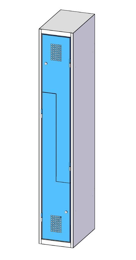 Wardrobe, Z-shaped split door, height 1850, width 300, depth 500 mm. Locking with cylinder lock or cap. Anti-prying stop surface, ventilation grilles, different color combinations. Walk-through width of wardrobe cell 250/115 mm. Price without label for name tag.
