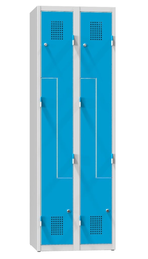Wardrobe, Z-shaped split door, height 1850, width 600, depth 500 mm. Locking with cylinder lock or cap. Anti-prying stop surface, ventilation grilles, different color combinations. Walk-through width of wardrobe cell 250/115 mm. Price without label for name tag.