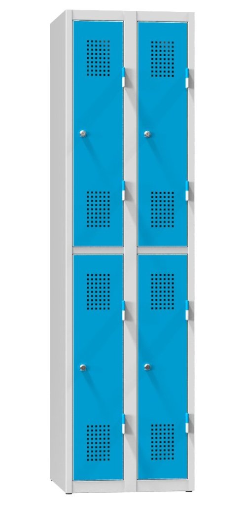 Four-door metal wardrobe divided by 1/4 width 500, 600 or 800 mm, height 1850 mm, depth 500 mm, at the top of each compartment there is a bar with three plastic hooks. Price without label for name tag.