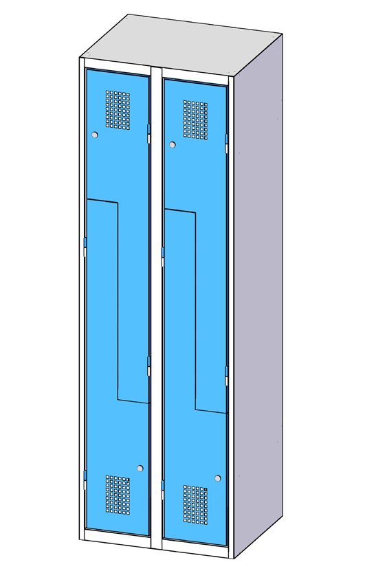 Wardrobe, Z-shaped split door, height 1850, width 800, depth 500 mm. Locking with cylinder lock or cap. Anti-prying stop surface, ventilation grilles, different color combinations. Walk-through width of wardrobe cell 350/165 mm. Price without label for name tag.