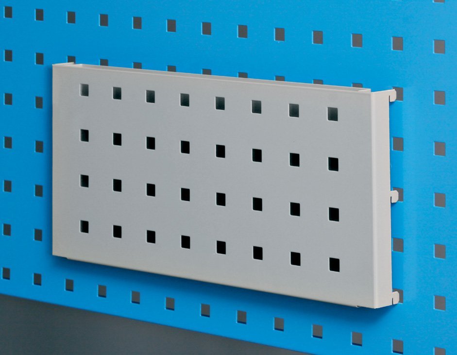 Perforated panels for tables, hang in 8NS webs, square holes 10 x 10 mm, hole spacing 38 x 38 mm. Height 380 or 190 mm, width for modules 1000, 1200 and 1500 mm.