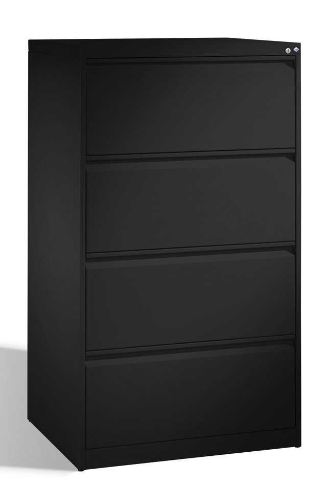 Four-drawer metal filing cabinets for documents or hanging files in A4 or Foolscap format, width 413 or 470, height 1321, depth 622 mm, central lock, various colors.