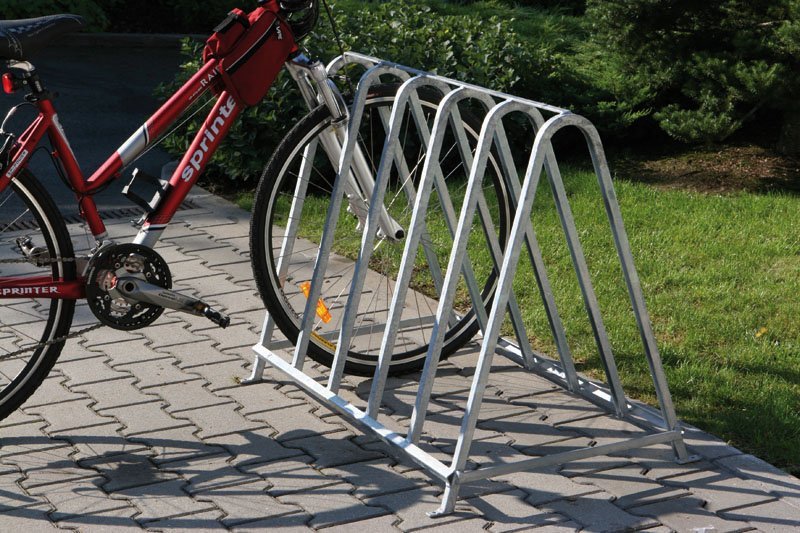 Stand for 5 bikes in two variants - to be concreted into the ground or to be anchored. Hot-dip galvanized surface - long service life of the stand. Stand width 1250 mm, weight 14 kg, stand width 82 mm.